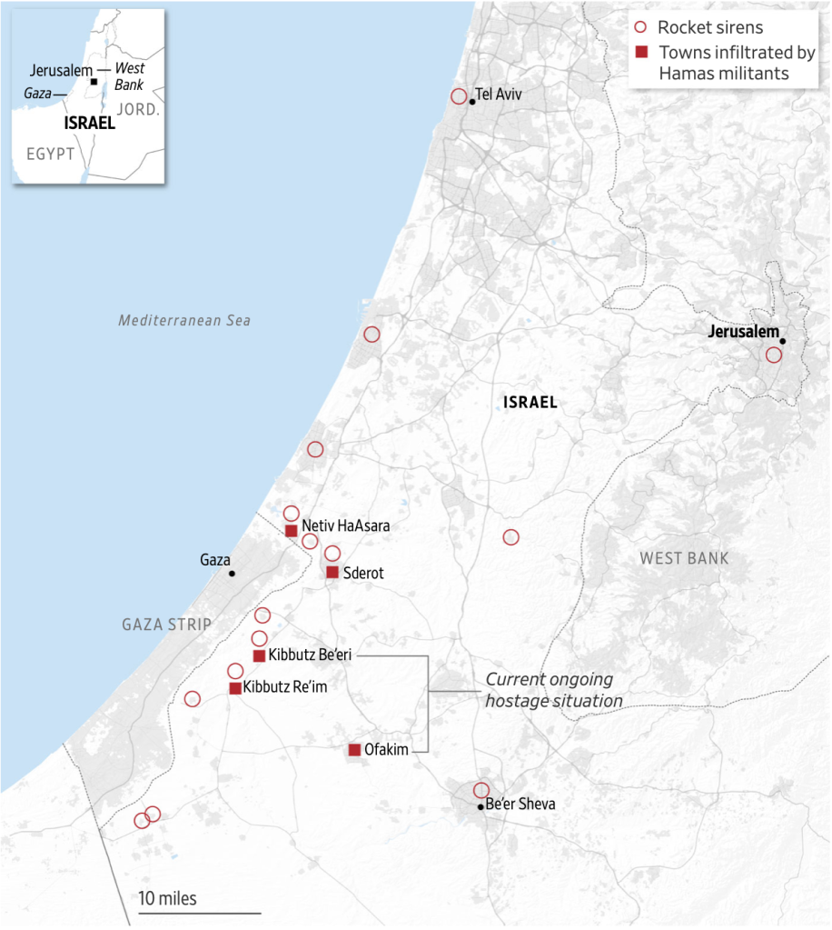 Where Hamas attacked Israel. Note: List of places where rocket sirens were heard is not exhaustive. Sources: Israeli military (rocket sirens); staff reports (infiltrated villages). Credit: Carl Churchill/THE WALL STREET JOURNAL
