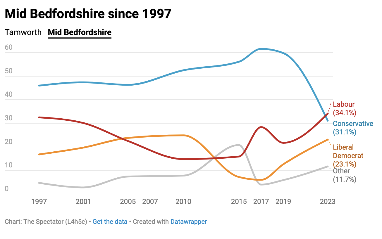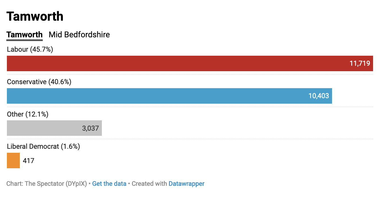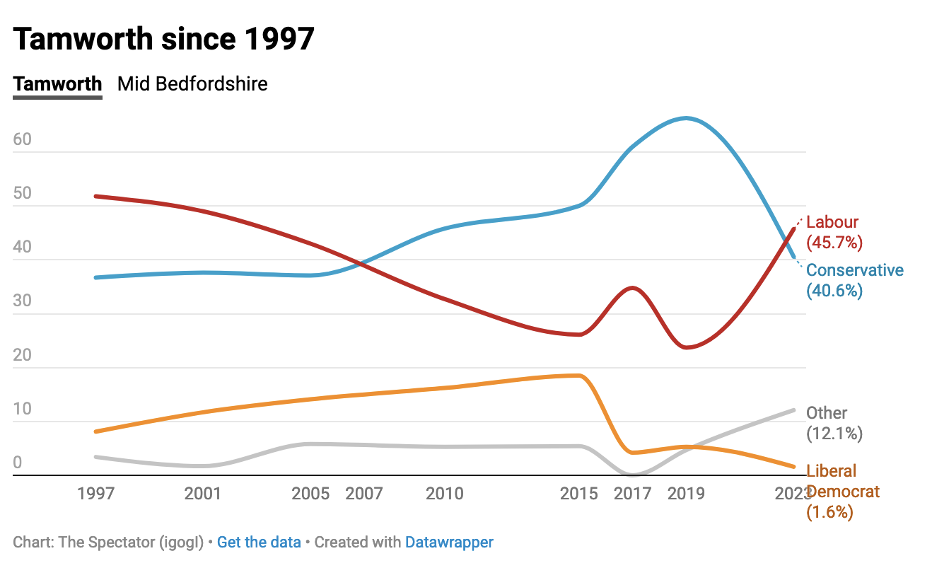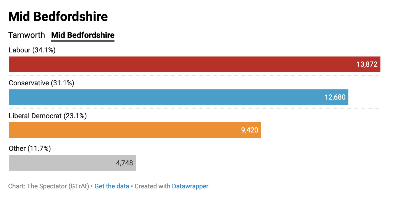 Unsurprisingly, Starmer has been quick to cite the results as evidence the public is ready for a Labour government: ‘Voters across Mid Bedfordshire, Tamworth and Britain want a Labour government determined to deliver for working people, with a proper plan to rebuild our country.’ It’s notable that in all the media interviews with Labour frontbenchers and the two new MPs, Alistair Strathern and Sarah Edwards, they have been at pains to say that Tory voters have moved to Labour.