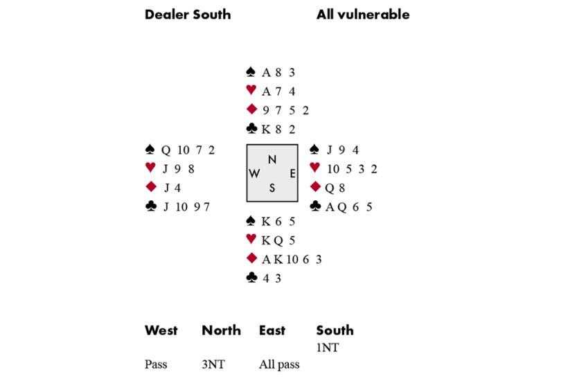 The contract was the same at all 8 tables in Division 1, as indeed was the lead of the ♣️J, and all except one table made. The hand looks ice cold and it’s hard to see how anything could be of interest; the defence takes four tricks in Clubs, and Declarer has the rest. But that’s before you put a world-class player like Gold in the East seat. The ♣️J was allowed to hold, but the continuing ♣️10 must be covered as the Ace could be with West. David won the Ace and also cashed the Queen, but then didn’t take the last Club. Why? Because against 3 NT we need five tricks, not four, and the last Club can be cashed by either defender if they get in. Instead he switched to the ♦️Q, and now look at it from declarer’s point of view. He doesn’t need five tricks in Diamonds – four will do – and if this is a singleton Queen, it would be a disaster if West got in with Jxx to take the presumed remaining two Clubs. So South very reasonably ducked the ♦️Q, and now David took the last Club for one off.