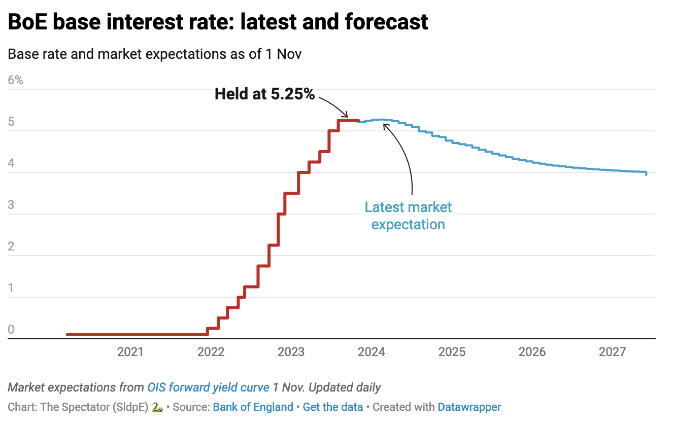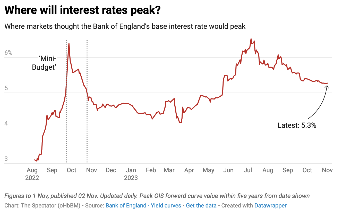 The Bank’s governor warned these votes would be ‘tight’ and hard to predict for the foreseeable future. But some are taking this second pause as a sign that rates have peaked. Capital Economics says it is ‘all-but confirmed’ now, while also noting that the ‘Bank is keeping the door open to the possibility of further rate hikes’. There is growing market consensus that rates have reached, or nearly reached their peak, as indicated in The Spectator’s data hub graph below.