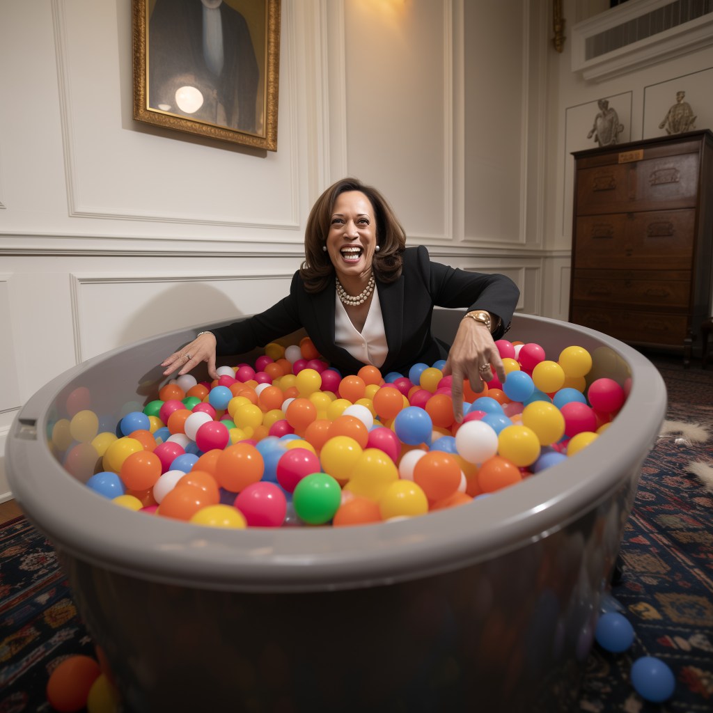 There’s a problem with that, though. Humans are already pretty rotten at all of those things. Seniors are accidentally kicked off their healthcare plans all the time. Disinformation is a permanent evil: it hasn’t been magicked into existence by AI. And we don’t need much help wrongfully imprisoning people. AI is meant to compensate for human error, whereas Kamala Harris seems to think it will create errors out of nothing. There was nothing about AI being a good thing for democracy: like widening human knowledge through ChatGPT, for example. I have found AI pretty democratic. For example, I was able to make this picture of Kamala Harris playing in a ball pit:
