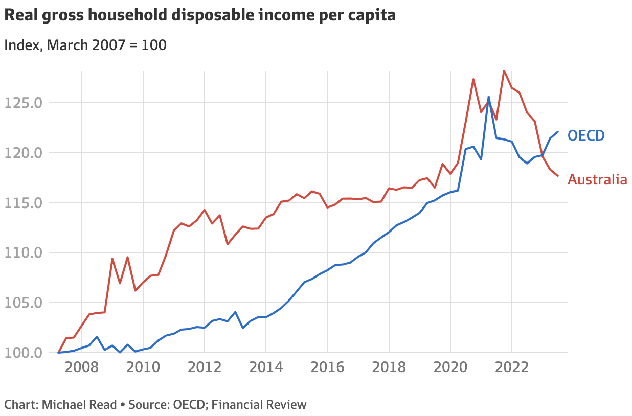 The Australian Financial Review’s Michael Read demonstrated how Australia experienced a sharp reduction in living standards during the third quarter of 2023, an outcome not seen within the OECD as a whole.