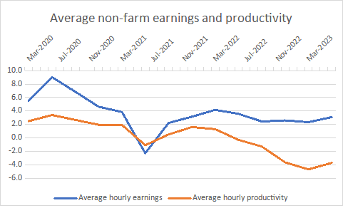 Productivity is the key to income levels and it has been falling in Australia. Real output per hour worked, following a brief post-lockdown recovery (the red line below) on the latest data (the June quarter of 2023), was over 7 per cent below the average level at the March quarter of 2022. The widening gap between wages (the blue line below), which continues to grow, albeit sluggishly, and productivity is unsustainable. Inflation is inevitable with such a gap.
