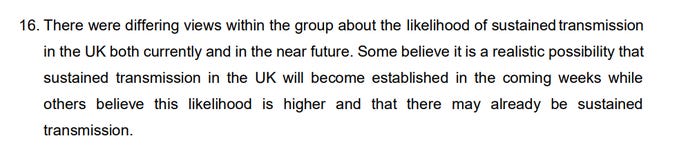 For example, there’s been a lot of discussion about whether the Prime Minister should have spent his February half term working on Covid: but the Sage modelling group statement below from February 17th hardly indicates a consensus from the scientists themselves that there was great urgency at this stage (‘a realistic possibility’ is Sage code for ‘just under a 50 per cent chance’. And they are talking about things starting to go wrong ‘in the coming weeks’ not right now).