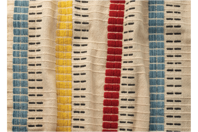Theirs was no cottage industry; they were savvy and professional. After the Festival Hall put them on the map, they were approached to weave the fabrics for Ben-Hur. Daunted by the epic scale of the production they were tempted to refuse, but on being badgered by a persistent wardrobe mistress from MGM they thought of an enormous figure and added several zeros, half hoping to lose the job. They got it. The most expensive film ever made called for 52,000 yards of specially woven fabric to clothe 452 actors, of which a red and brown striped length worn by Charlton Heston for the hero’s visit to a leper colony – tricky wardrobe choice – features in the show (see below).