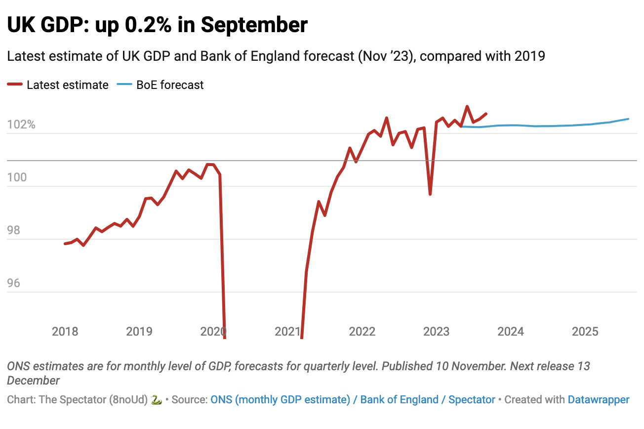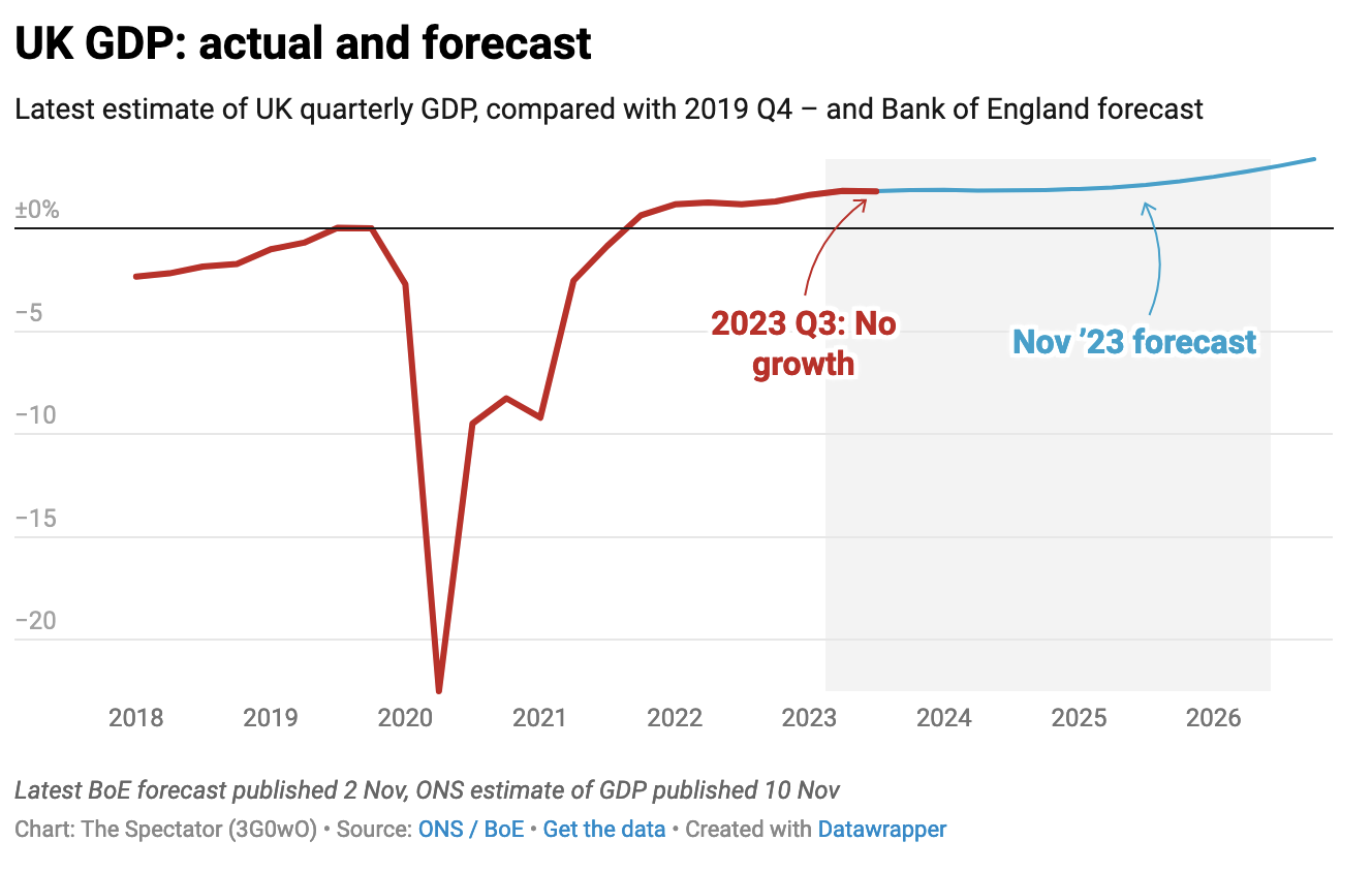 The provisional Q3 figures are out this morning as well, showing no economic growth between July and September. A tiny 0.1 per cent uptick in the services sector was offset by a small fall in construction output, which has led to a flatlining economy. Compared with the same quarter in 2022, GDP has increased by 0.6 per cent, but the government’s pledge to get the economy growing this year looks like it has fallen flat, as no meaningful growth figures have been conjured up yet.