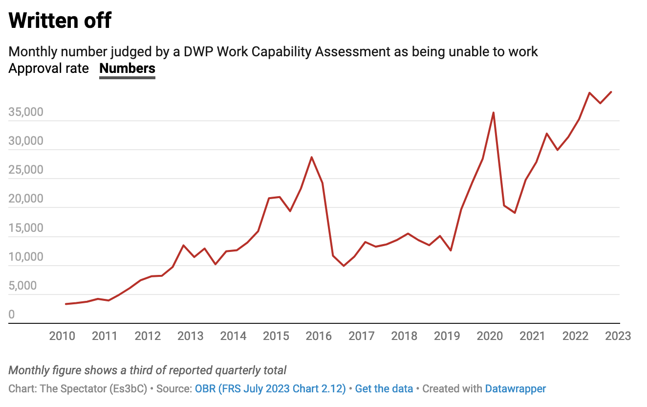 In short, the rise of mental health complaints has discombobulated the welfare system with high numbers being sent to the economic scrap heap deemed unable to do any work. It’s now at almost 40,000 a month: