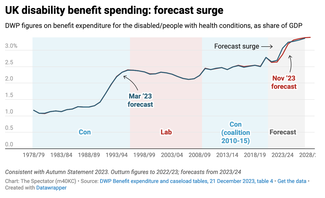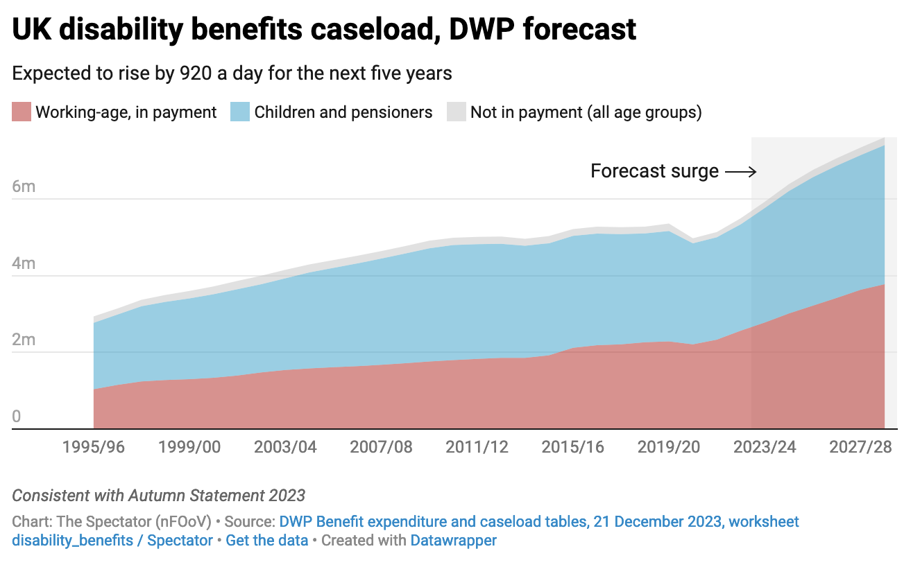 The previous forecast envisaged just over 1,000 a day, so Mel Stride’s reforms do make a difference. But a small one. This remains a full-blown crisis that will have to be dealt with by whoever wins the next general election because of the financial cost: so big that it’s measured as a share of GDP rather than in mere billions.
