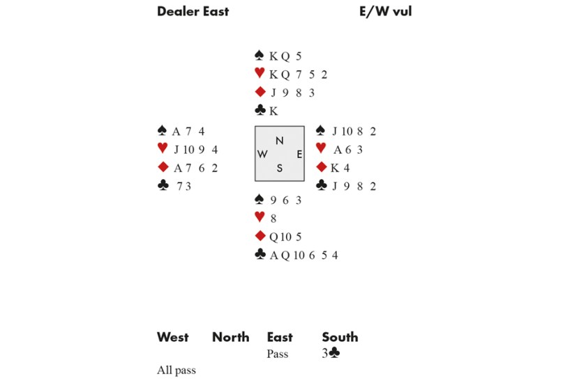 West started with the ♥️J to the King and Ace, and East found the switch of the King of Diamonds and a second diamond. I tried the old trick of dropping my ♦️Q and 10 on the two rounds of Diamonds, not at all guessing what would happen. West cashed the ♠️A before leading a third Diamond. East wasn’t sure I had any more of those, and since she was looking at a ‘certain’ trump trick, she elected not to ruff but discarded a Spade.