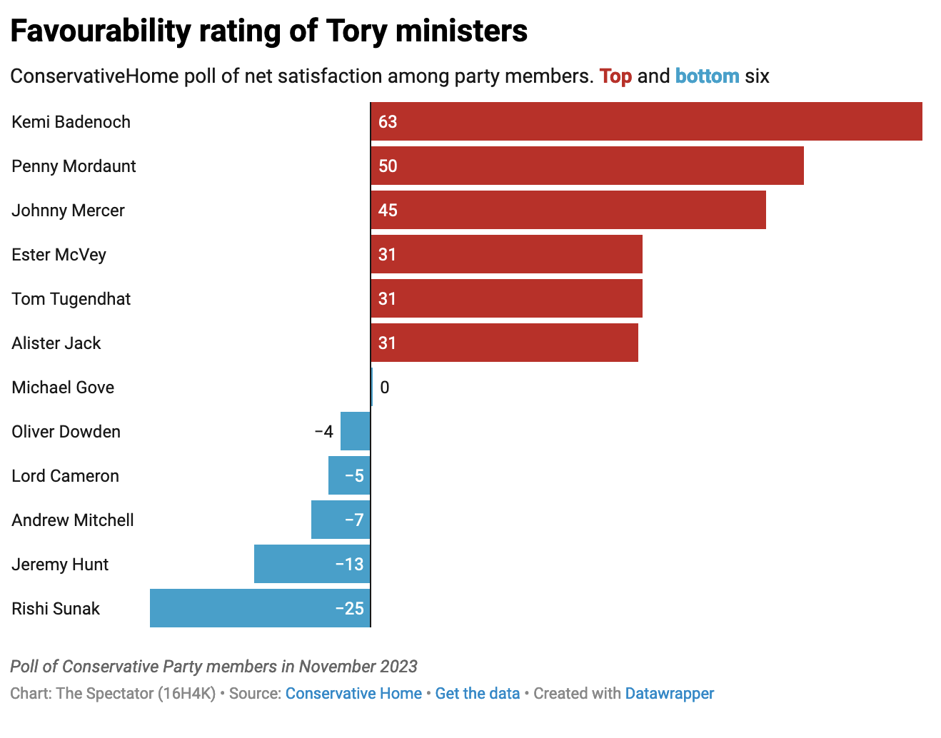 Indeed, just about the only members of the cabinet polling well are those that, er, stood against Sunak in the summer of 2022. Kemi Badenoch, on 63 points, and Penny Mordaunt, on 49.8, are the only Cabinet members who break the half-century barrier while Tom Tugendhat finishes fifth on 31.2. Newly-appointed Esther McVey and army man Johnny Mercer make up the rest of the top five too.