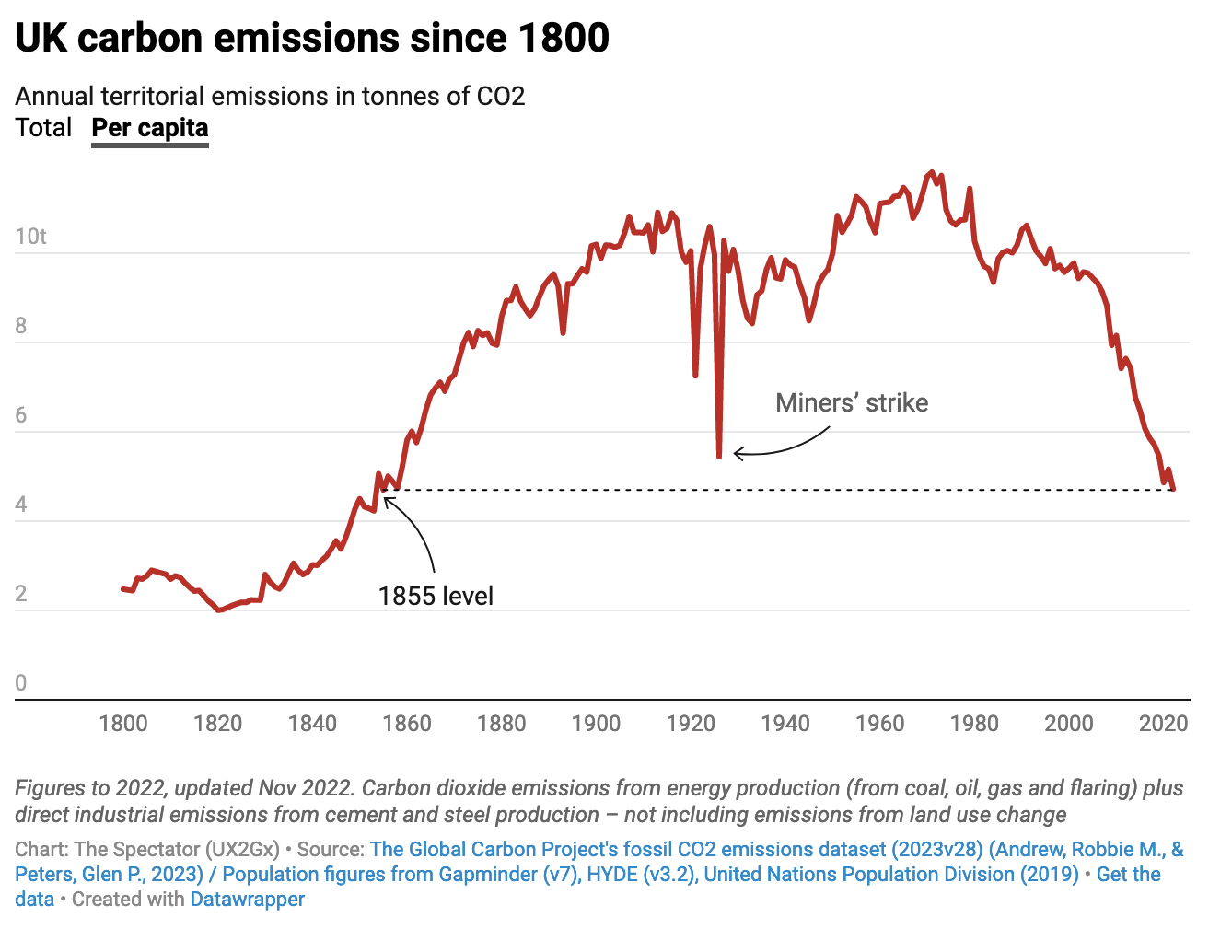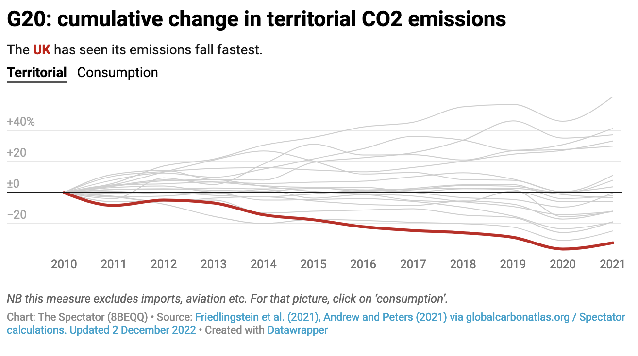 ‘We’ve already decarbonised faster than any other major economy,’ he said. ‘Our emissions are down 48 per cent since 1990, compared to limited cuts from others. And a 300 per cent increase from China.’ The PM has a point: the below graph shows Britain’s historic carbon emissions and, underneath that, its progress amongst the G20 in the last 20 years. We’re the fastest in the G20; factor in imports (looking at carbon ‘consumption’ rather than territorial emissions) and we’re the second fastest.