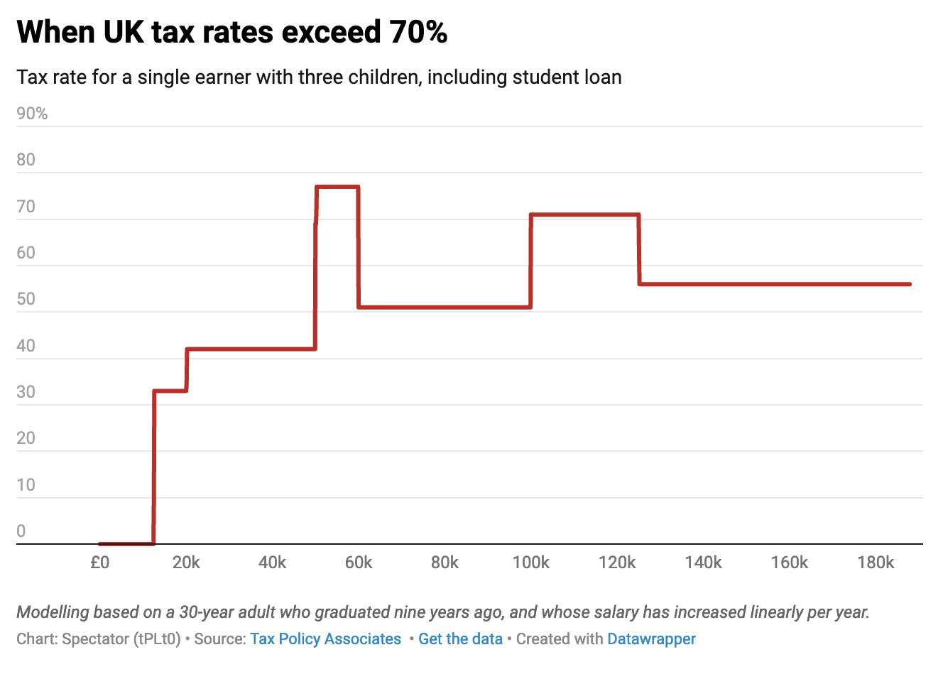 Other ideas mentioned in the Telegraph are to U-turn on Rishi Sunak’s freezing of tax thresholds or cut the headline standard rate of tax, currently 20 per cent. The latter measure would help everyone in full-time employment but would surely come across as too easily reversible to reawaken tribal faith in the Tories. The former measure – raising the tax threshold bands – would be awkward personally for Sunak. However a cut on the higher rate threshold, which kicks in just above £50,000, could help to solve a horrendous tax trap that is destroying incentives for ambitious middle earners. Currently the combined impact of a 40 per cent tax rate, the scraping back of child benefit between £50,000 and £60,000, a 9 per cent graduate loan repayment charge and another 2 per cent in national insurance contributions is leading to marginal tax rates above 70 per cent for many in this income range.