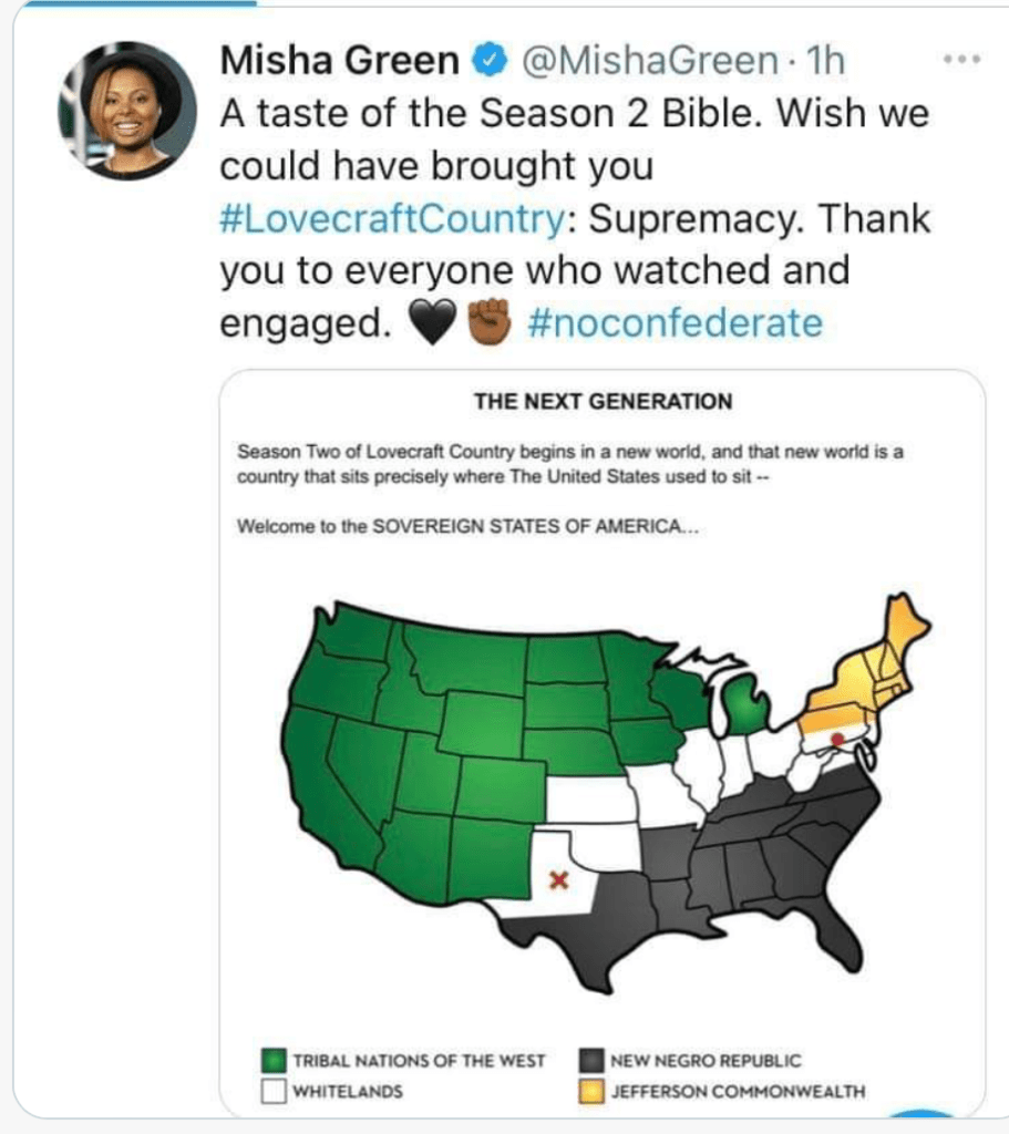 Misha Green, the showrunner of HBO/Max’s cancelled Lovecraft Country, tweeted out, amid the Civil War discourse, that the show’s second season was going to depict a Civil War among the “Sovereign States of America,” divided into the “Jefferson Commonwealth” of New England, the “New Negro Republic” of the South, the “Tribal Nations” of the West and the “Whitelands,” which somehow include Ohio and Illinois but not Wisconsin. Alas, we’ll never get to see that Civil War 2, but there are many other options available.