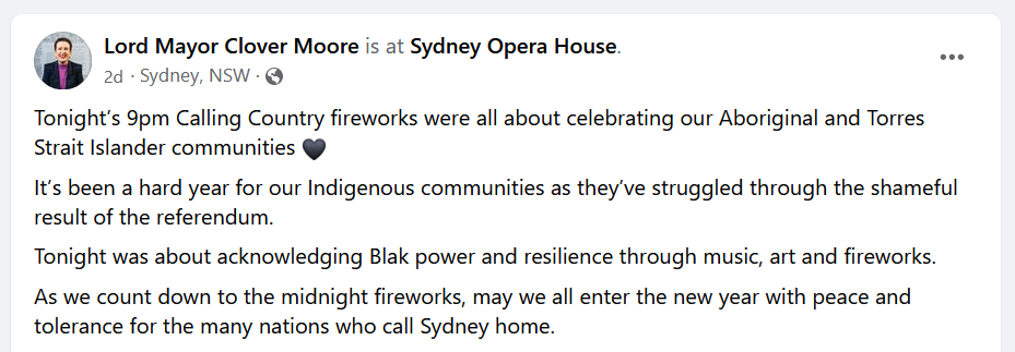 Sydney Lord Mayor Clover Moore made the situation much much worse when she stepped out to defend the ‘Calling Country’ fireworks. Yes. That is a real name that people we pay for gave to a fireworks show.