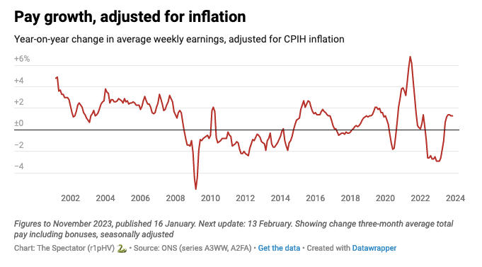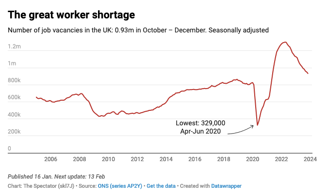The jobs market has turned a corner. Vacancies have fallen again to 934,000, down 49,000 in the last three months of the year, the longest continuous fall on record. Wage growth slowed to 6.5 per cent in cash terms – which will please the Bank of England – but luckily for workers inflation is falling faster, meaning those rises translate into real terms pay bumps (of about 1.3 per cent). Employment climbed slightly while unemployment remained flat.