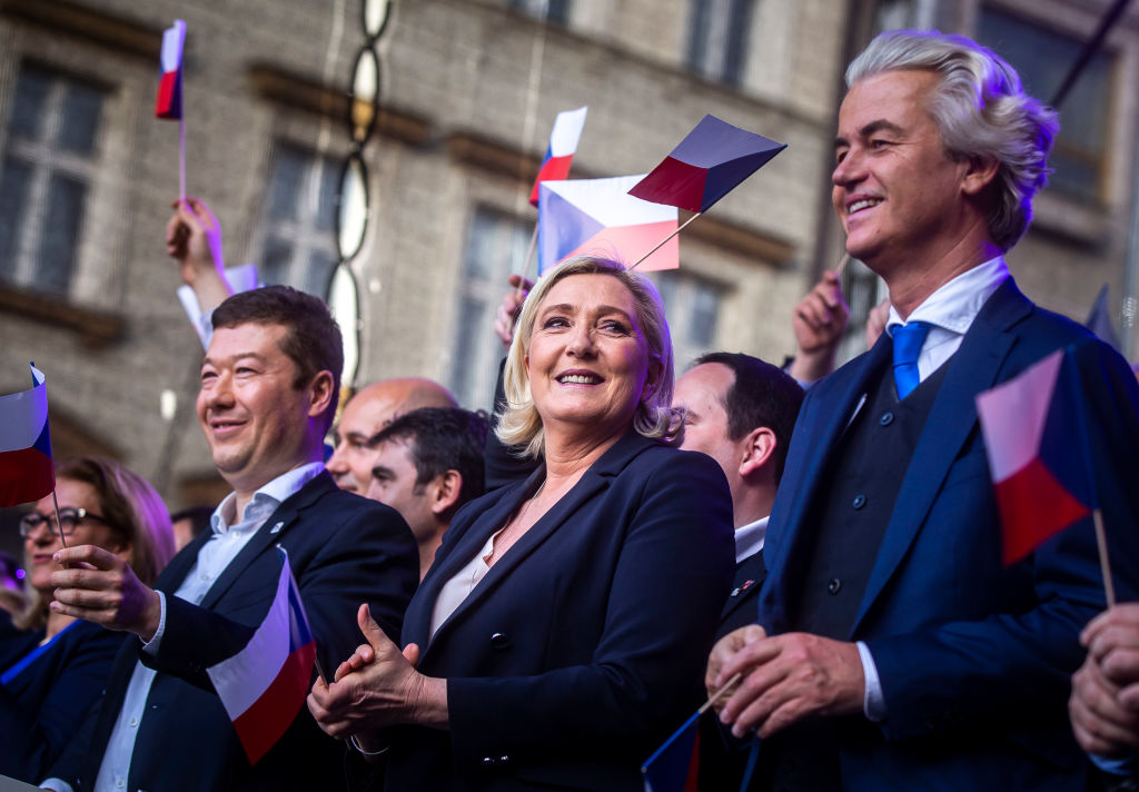 Right-wing European party leaders Tomio Okamura, Marine Le Pen and Geert Wilders in 2019 (Getty Images)