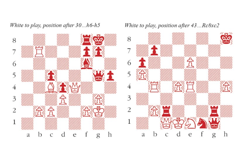 In this turbulent game, Bartel has relentlessly annihilated White’s kingside. His original queen was sacrificed, and the one on g1 is a promoted piece! Niemann’s king has run from h1 to d1, and Bartel has just chopped off a bishop on c2. Had Niemann held his nerve with 44 Qh6+ Kg8 45 e7! the attack would have fizzled out, e.g. 45…Rgd2+ 46 Qxd2 Rxd2 47 Kc1 and White wins. 44 Qxc2? Not quite a losing move, but a huge error. Rxc2 45 Nxc2 Ne3+ 46 Kd2 Qf2+ 47 Kd3 Nxc2 48 d5 48 Rxb7! Qf3+ 49 Kd2 Qxe4 50 e7! leaves Black nothing better than a perpetual. Nxb4+ 49 Rxb4 Qc5 50 Rd4 Qd6 51 Ke4 Kg7 52 Rd3 With the pawns blockaded, White must act decisively. 52 h5! Kh6 53 Kf3 Kxh5 54 Re4! Qxd5 55 e7 seems to save the game. Qh2 53 Rc3 Qxh4+ 54 Kf5 Qh5+ 55 Ke4 Qh4+ 56 Kf5 Qh2 57 Ke4 Kg6 58 Rc8 Qd6 59 Rc2 Qg3 60 Rc8 Kg7 61 Kd4 Qf4+ 62 Kd3 Qd6 63 Kc4 Kf6 64 Rh8 Qc7+ 65 Kd4 Qg7 66 Rh1 Ke7+ 67 Kc5 Qg6 68 Rc1 Qd3 69 Rc4 Qe3+ 70 Rd4 Qc1+ 71 Rc4 Qxb2 72 Re4 Qb5+ 73 Kd4 Qxa5 74 Ke5 Qc7+ 75 Kf5 White resigns