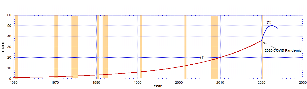 Chart 2: $1 in 1959 will deflate by the exponential (red) curve followed by the blue curve (2) as shown. This is the price inflation of 1/35 oz of gold over this time period resulting only from the expansion of the M2 currency supply. Thus the gold price is inflated by a factor of 47 by the end of 2023 in terms of current dollars. This means that the USD has lost about 98 per cent of its value in the last 65 years. If the price of gold remains constant in terms of 1959 dollars then its current price is only rising due to inflation. However, after 2020 the anomalous curve (2) had to be used to allow for the massive additional deflation of the dollar’s value in that period.