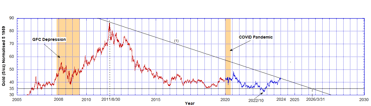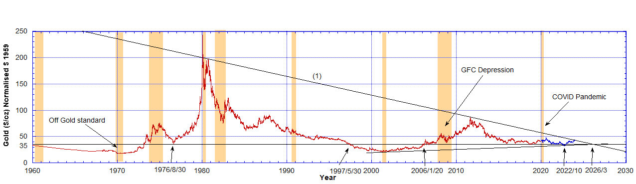 Chart 3: The price of an ounce of gold in 1959 dollars. The red data are the price of gold ($/oz) scaled by the USD normalisation curve from Chart 2 using curve (1) and the blue data are scaled using curve (2). The historical gold price data were downloaded from Auronum, the National Mining Association and YCharts. The horizontal solid line is the $35 price for an ounce of gold from 1959. The descending solid straight line (1) touches the tips of the peaks except in 1980 where a few points break above it. The bottom ascending solid line, in two places, touches the minimal gold price and also coincides with the same apex point in 2026. The sepia strips indicate recessions.