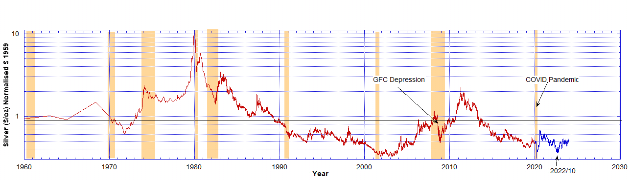 The price of silver in 1959 started at $0.90. The horizontal solid line indicates this level. Now that all dollars are 1959 dollars we can see the real price of silver over the past 65 years. Any time it dipped below 90 cents it was undervalued in real terms. Any time it was above that line it was higher in real value. Since 1990 it has been undervalued up until the present except between July 2010 and November 2013. Note the drop in the real price (in 1959 $ terms) of silver during recessions. Particularly note the price drops during the 2008 GFC Depression and the 2020 Covid Pandemic.