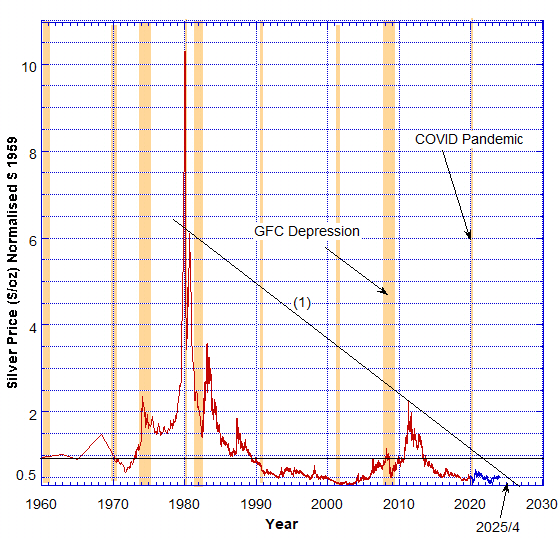 Chart 6: The price of an ounce of silver in 1959 dollars on linear axes. This is the same data from Chart 5 except a linear vertical axis is used. The red data are the price of silver ($/oz) scaled by the USD normalisation curve (1) and the blue data are scaled using curve (2) from Chart 2. The horizontal solid line is the $0.9 price for an ounce of silver from 1959. The sepia strips indicate recessions.