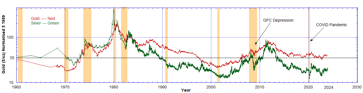 Chart 7: The price of an ounce of gold (red) and an ounce of silver (green) in 1959 dollars on Log-Linear axes. The gold price ($/oz) axis is logarithmic and the time (year) axis is linear. The solid horizontal line is the $35 price of an ounce of gold from 1959. The silver price has been converted to an equivalent gold price by the factor 35/0.9 = 38.9. Between 1959 and 1970 the data are sparse.
