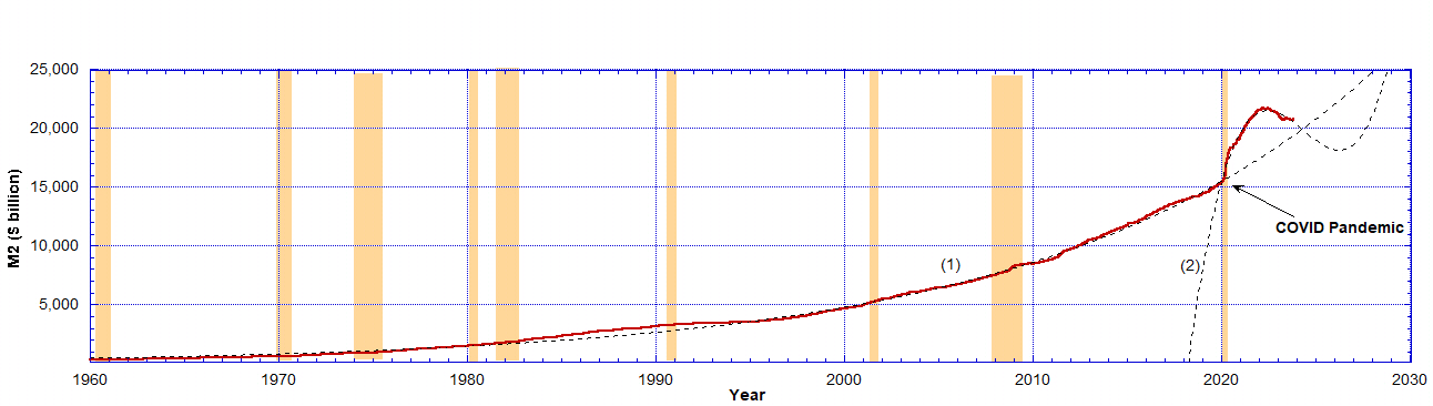 Chart 1 is a plot of the USD M2 currency supply from 1959 to December 2023. The dashed curve (1) is an exponential fit to that data from 1959 to 2020. The data after the 2020 Covid Pandemic does not follow the exponential trend line due to the extreme credit creation via quantitative easing (QE4) in the Covid years. Therefore we have used a 5th-order polynomial fit, dashed curve (2), to model the expansion of the M2 money supply. That is, we have had to treat these two periods, pre and post-2020, separately.