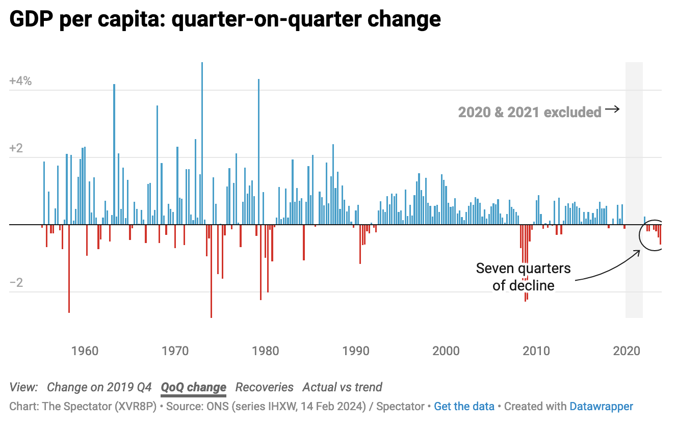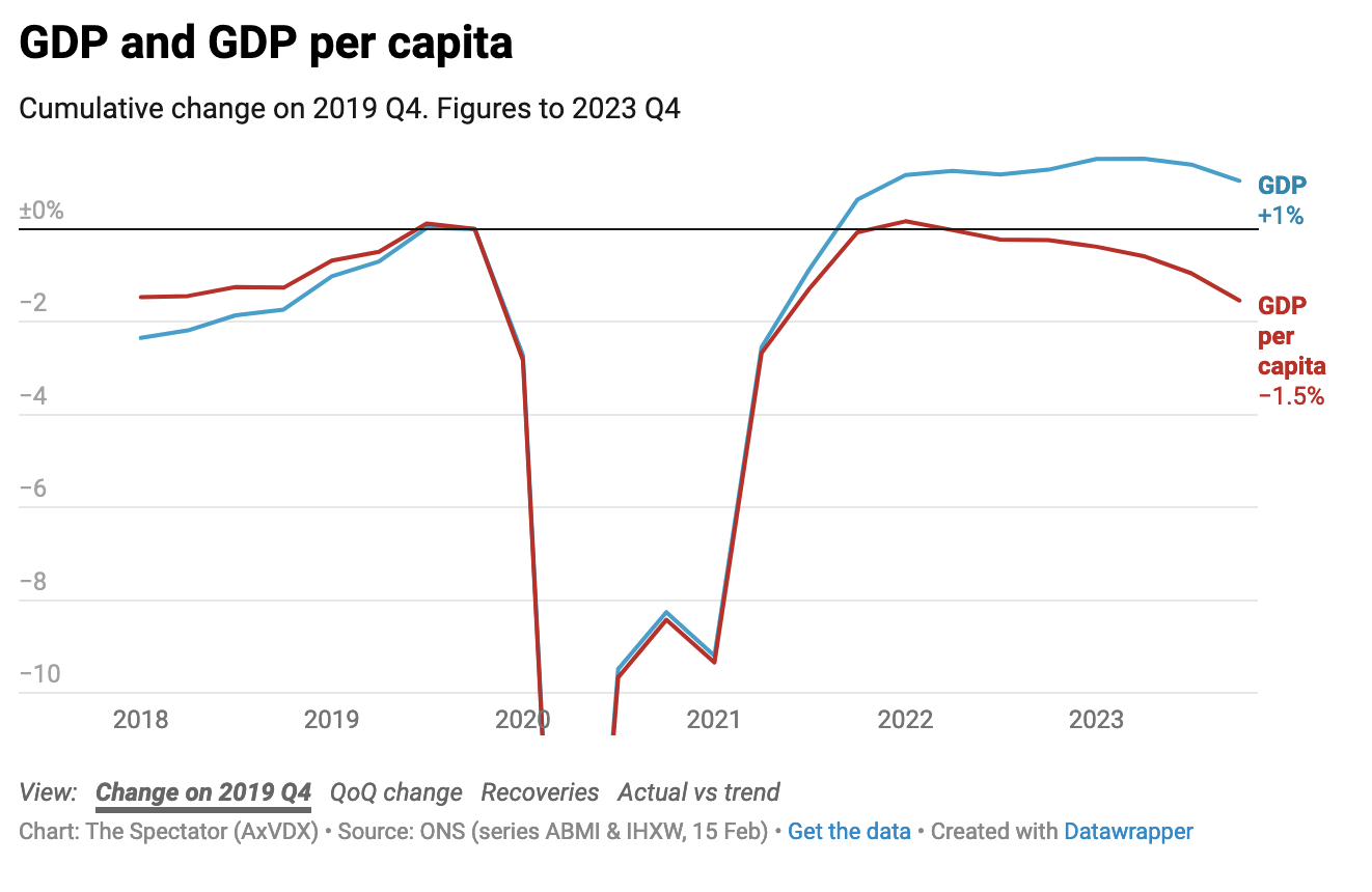Yet promises were made – and they weren’t kept. The UK’s recession is very likely to be short and shallow – and anyone who wants a job is still in a great position to get one – but these graphs from The Spectator data hub illustrate why people are bound to feel the pain. Even if headline GDP figures are only taking a temporary knock, GDP per capita (which measures how prosperous, on average, a country’s residents are) has been falling for almost two years now – never properly recovering from the pandemic.