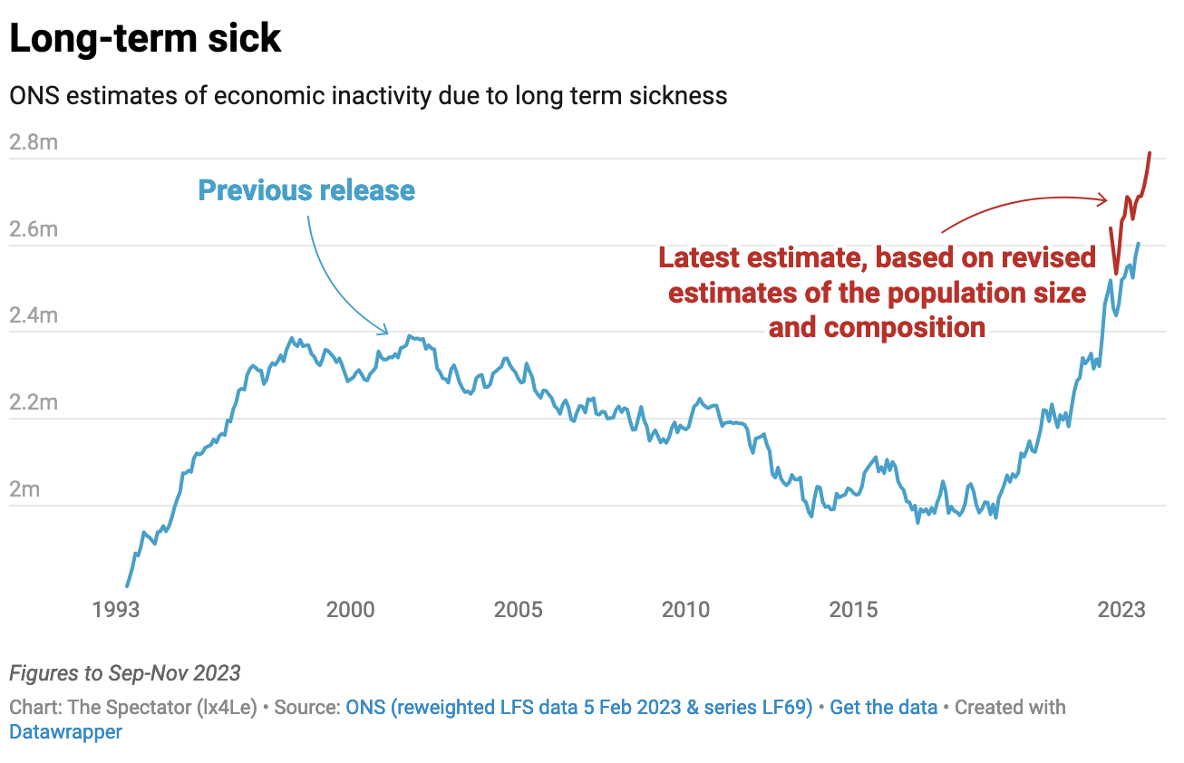 We already know that Britain has a massive sick-note problem but we did not, until today, know just how large. Every three months, the ONS surveys 35,000 people and uses the results to guess how many (for example) are not working due to long-term sickness. That figure had been 2.6 million. But it has today been revised upwards by 200,000 – equivalent to the population of Norwich or Aberdeen – to 2.8 million. The chart of those too sick to work, already one of the most alarming in UK economics, now looks even worse.