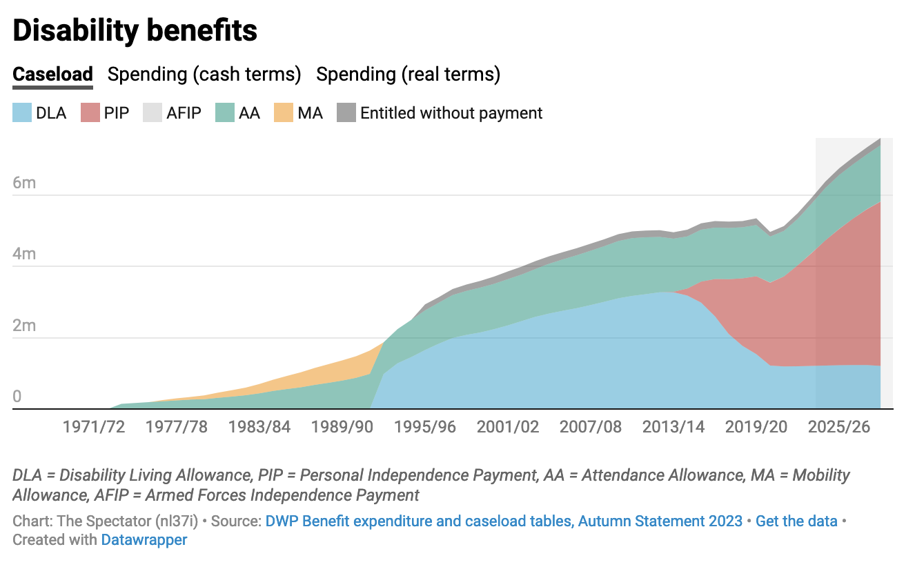 This matters because the UK is still suffering massive worker shortages (almost a million vacancies) which has been sucking in immigration. So the sick-note culture is creating a vacuum in the heart of the labour market, increasing net migration and resulting pressures. This is projected by the DWP to get much worse: we have compiled its forecasts in the Spectator data hub. One of the charts is below. The shaded grey area will be the challenge confronting whoever wins the next election.
