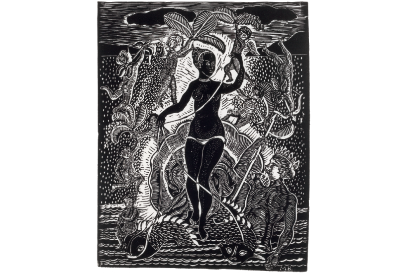 Turner’s ‘Slave Ship’, the object of ridicule when first unveiled at the Academy weeks after a London meeting of the World Anti-Slavery Convention, was the inspiration for Bowling RA’s fiery ‘Middle Passage’ (1970) and a key influence on Ellen Gallagher’s ongoing ‘Watery Ecstatic’ series, imagining a Black Atlantis peopled by the descendants of pregnant slaves thrown overboard during the Atlantic crossing. The theme of black humanity reborn from the waves is echoed in Kara Walker’s etching ‘no world’ (2010), in which a giant pair of black hands holds the silhouetted form of a Baltimore clipper – a favoured means of transport for perishables, including slaves, because of its speed. But the most powerful image of watery resilience is the simplest. In the early 1950s the black American educator and artist Margaret Burroughs took a sabbatical from teaching in Chicago to study revolutionary printmaking in Mexico. Her ‘Black Venus’ (1957) takes the jingoistic imagery of Thomas Stodhart RA’s ‘Voyage of the Sable Venus from Angola to the West Indies’ (1794), with its dusky beauty riding in a scallop-shell chariot attended by a sea god holding a Union Jack, and manages to completely subvert it by ditching the flag and translating the soft-focus into stark black and white. ‘Slave masters,’ Burroughs later wrote in explanation, ‘selected the most beautiful of the virgin black slave women for their own personal use. And yet these women survived to become mothers of a nation.’