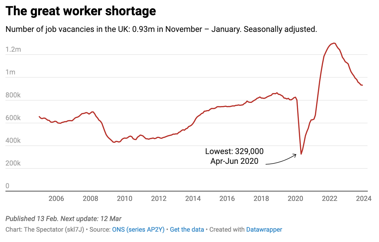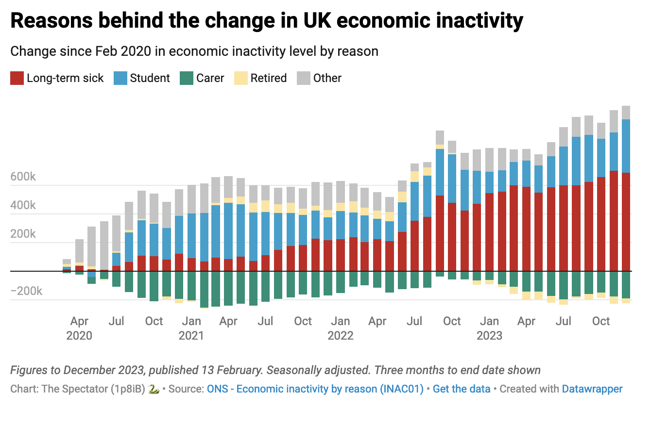 Meanwhile the economic inactivity rate for working-age people remained ‘largely unchanged’ at 21.9 per cent. This is a higher estimate than what was expected last year, driven by the historically high numbers of people on long-term sick leave. As Michael Simmons reported last week when the revised data was published, changes to the Labour Force Survey actually saw the estimates increase by a staggering 200,000, taking the total to 2.8 million. The ongoing combination of mass job vacancies and workers dealing with long-term conditions helps explain why, this morning, we also see foreign-born workers in the UK making up nearly 21 per cent of the UK’s workforce in the last quarter of 2023 – a rise from 18.1 per cent in the first quarter of 2020, when Britain formally left the European Union.
