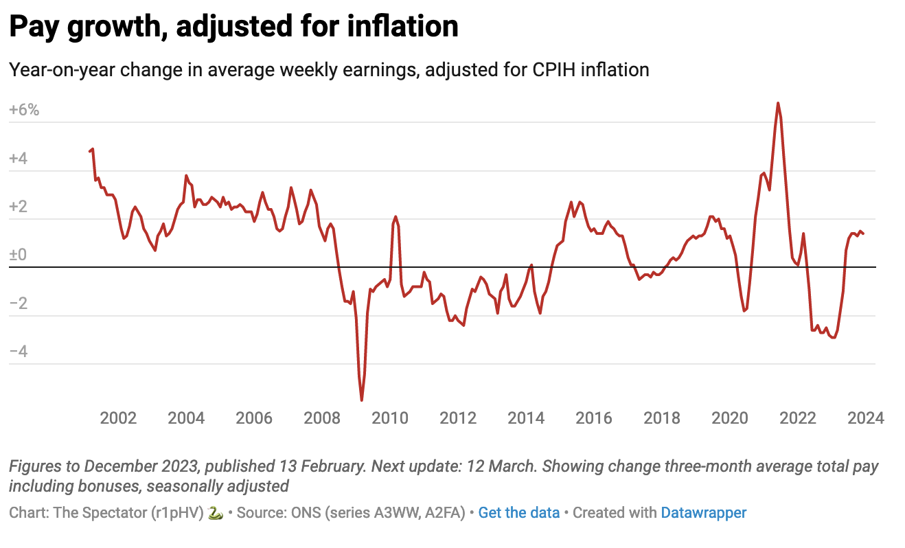 Job vacancies fell for the nineteenth consecutive time – but not by much. Vacancies were down to 932,000 on the quarter – a fall of 26,000, still well above pre-pandemic levels. Despite expectations that the unemployment rate would rise slightly, it fell again in the three months to December, from 3.9 per cent down to 3.8 per cent. These numbers are meant to be treated with ‘additional caution’ as the Labour Force Survey is still lacking critical data, but the evidence from the new reporting scheme continues to show signs of a tight labour market.
