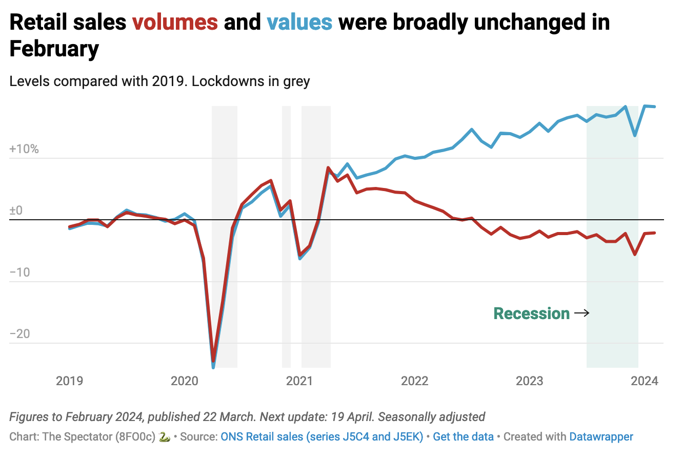 At the moment, no one can say we are exactly in boom conditions. Indeed, retail sales volumes are still lower than they were at the same time in 2019. That is a half-decade of reversal in sales. As far as retailers are concerned, Britain is not emerging from a brief recession which lasted two quarters – it is still stuck in a long-term recession