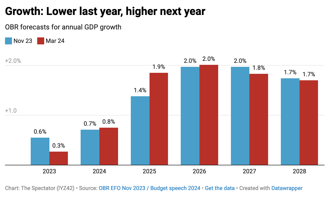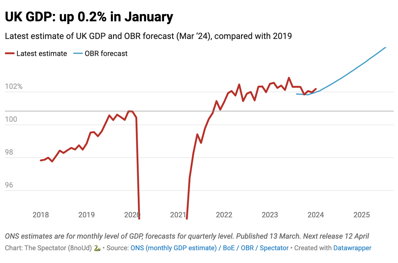Is this the spectacular economic turnaround that Britain has been waiting for? GDP still fell 0.1 per cent in the three months to January, compared to the three months before – a hangover of last year’s repeated economic contractions, which eventually amounted to a technical recession. Moreover, 0.2 per cent growth remains difficult to boast about, not least when the latest forecast for growth in 2024 is a measly 0.8 per cent. These numbers still point to a stagnant economy that continues to struggle to boost GDP since the initial pandemic recovery.