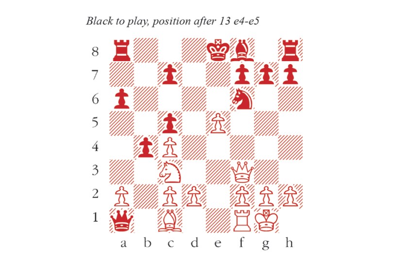 1 e4 e5 2 Nf3 Nc6 3 Bb5 a6 4 Bxc6 dxc6 5 0–0 Be6 6 b3 c5 7 Nxe5 Qd4 8 Nc4 Bxc4 9 bxc4 Qxa1 10 Nc3 Karjakin has snatched a rook, but his queen is in grave danger. b5 11 Qh5 Nf6 12 Qf3 b4 13 e5 (see diagram) White’s 11th move was ostensibly a loss of time, but now this advance attacks both Ra8 and Nf6. 0–0–0 14 Ba3 Qxf1+ 15 Kxf1 bxc3 16 exf6 cxd2 17 Qa8+ Kd7 18 Qd5+ Kc8 19 Qa8+ Kd7 20 Qd5+ Ke8 21 Qe4+ Kd7 Draw agreed