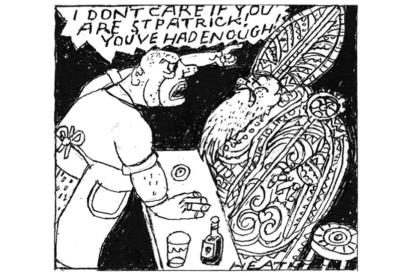Debauchery, or certainly drunkenness – undoubtedly a part of St Patrick’s Day – was a useful way to escape the rigours of Lent. He refers here to a lost custom of drowning the shamrock which entails taking it from your lapel or hat and putting it in the last glass of the day. When you’ve drained it, you dig the shamrock out and toss it over your left shoulder, presumably to get the devil in the eye.