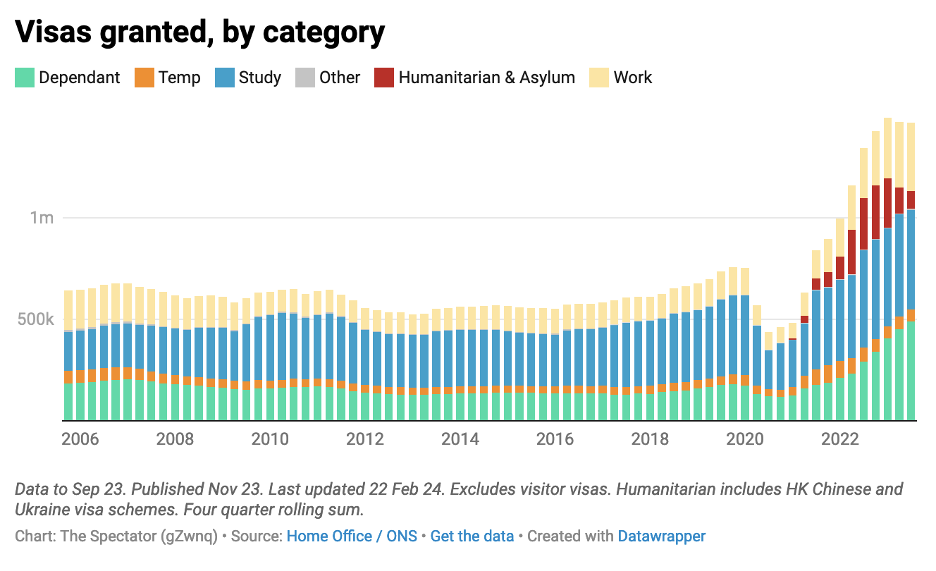 But the government has more than a year’s worth of data to be released before those new rules kick in (from April this year), the next bulk of which has been released this morning. And while we’ll need to wait until spring to get the next update on overall net-migration (last calculated at 672,000 in the year to June 2023), there is already strong indication that the government is in for another year of big numbers.