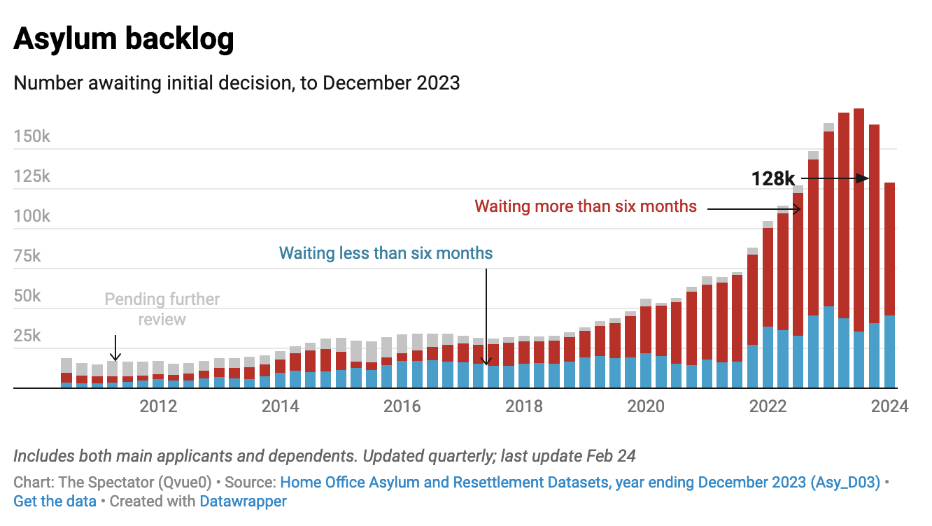 The record for asylum claims is also a mixed picture: there is evidence that the government is finally processing applications at a faster rate, with the number of people in ‘receipt of asylum support’ down 10 per cent between September 2023 and December 2023, and the number of people in hotel accommodation down 18 per cent, to 45,768. But overall 62,336 applicants were granted refugee status, ‘the highest number of people granted since records began (in 1984), due to the combination of a high grant rate and high volumes of decisions being made.’