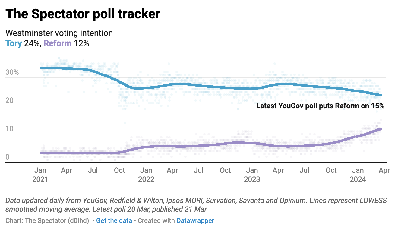 Those in Reform believe they have an opportunity to seize this moment of peak Tory unpopularity (few prime ministers have seen approval ratings as low as Sunak has now) and use it for a realignment of politics. This latest poll suggests their plan is gathering pace.<//>