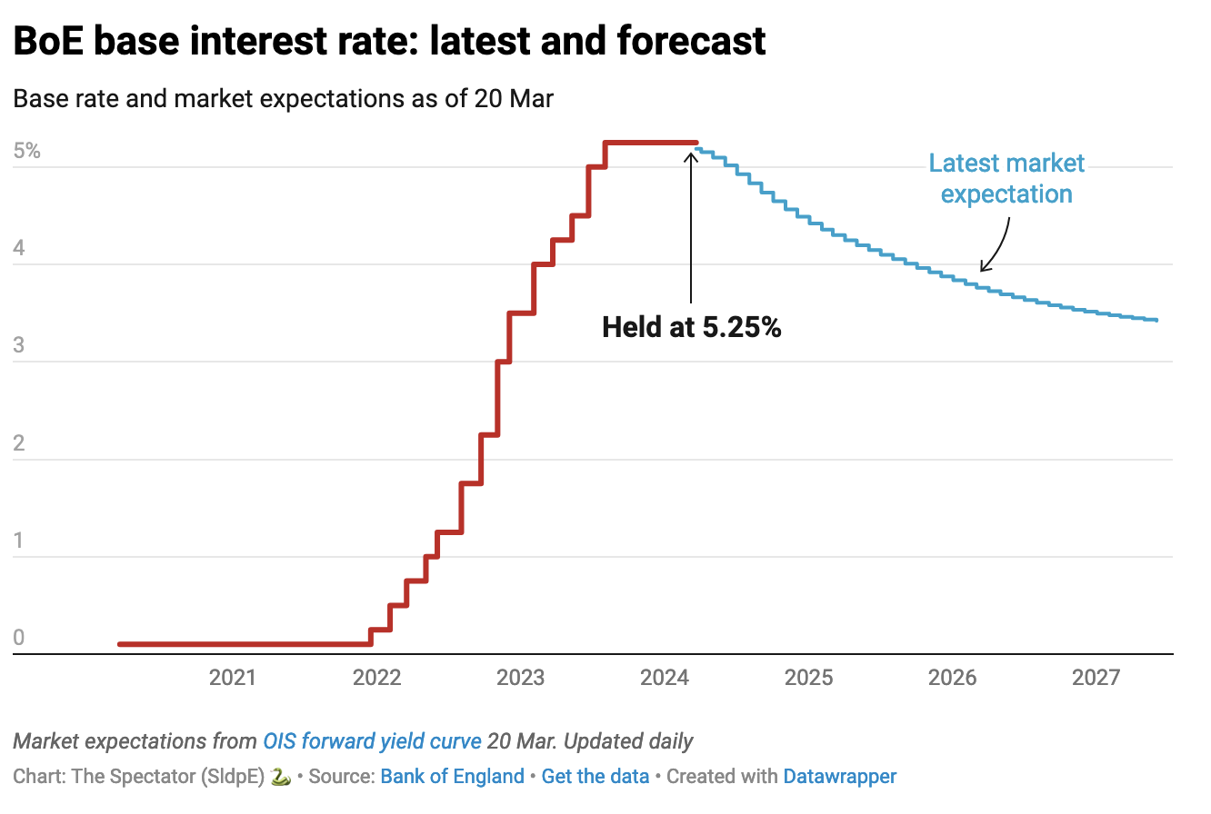 It was widely expected that the Bank would vote to hold the rate. News earlier this week that inflation slowed again in February, to 3.4 per cent on the year, was certainly a necessary condition for the BoE to consider a rate cut. But Threadneedle Street has been clear for months now that it needs to see evidence that once inflation returns to its target of 2 per cent – which is expected to happen this spring – this can be sustained in the medium term. Today it has stuck to that language, insisting rates must ‘remain restrictive for sufficiently long to return inflation to the 2 per cent target sustainably in the medium term in line with the MPC’s remit’.