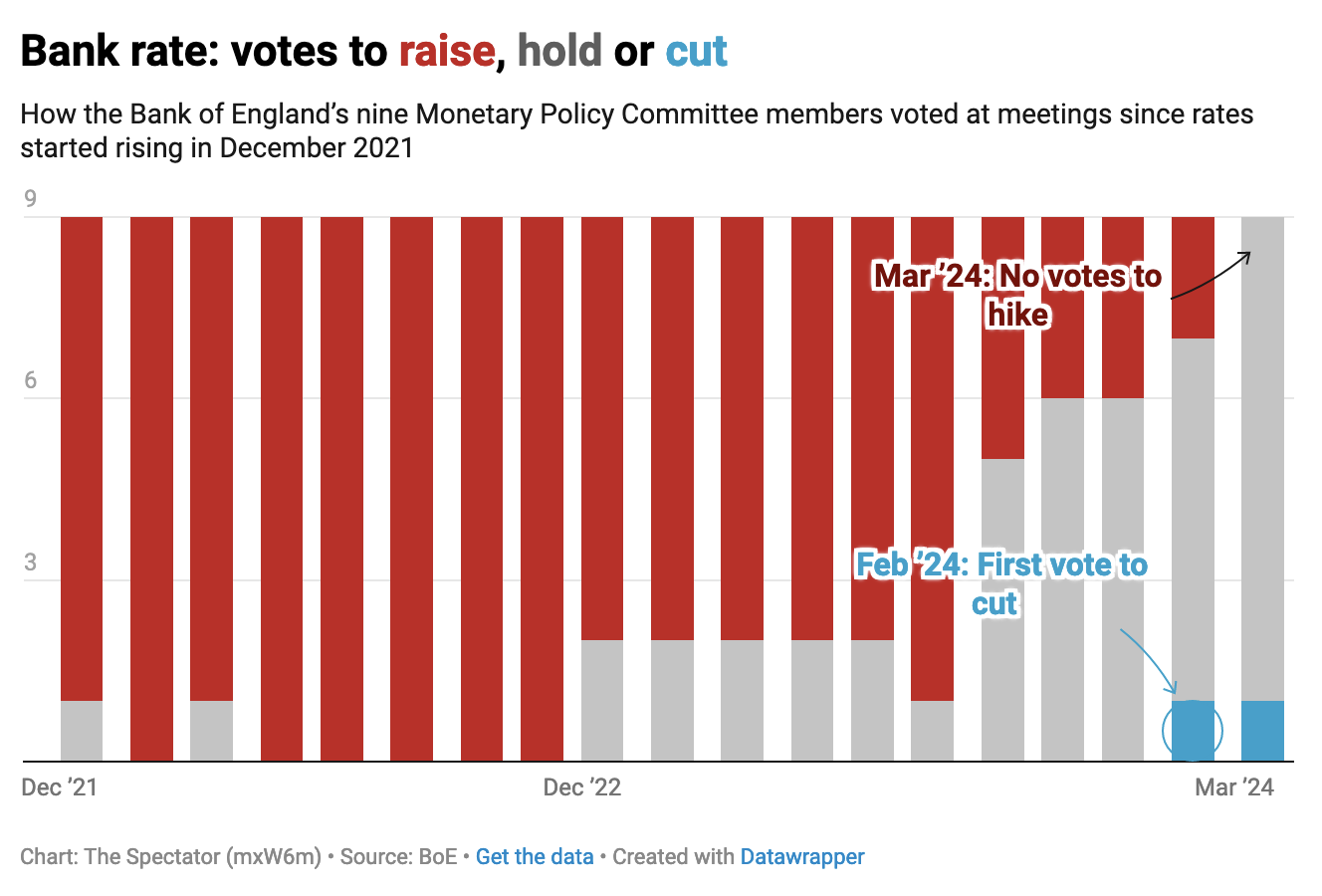 What more will the Bank need to see to start cutting rates? Today’s meeting minutes forecast that the headline inflation rate could fall ‘slightly below’ the Bank’s 2 per cent target in Q2 this year, then rise closer to 3 per cent in the second half of the year. Ongoing risks to another inflation bump (albeit nothing like what we saw last time) have the MPC judging that inflation risks are ‘skewed to the upside over the first half of the forecast period’.