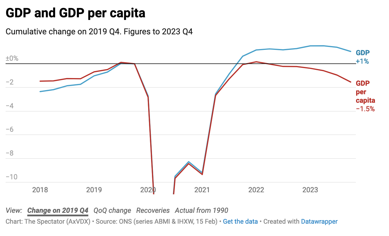 As yesterday’s British Social Attitudes survey revealed, there is widespread disappointment with the level of access the public has to the social services they pay for: in this case, the National Health Service. The NHS has a record-low approval rating, as people struggle to get GP and hospital appointments. But stagnant growth is taking its toll, too. While the size of the economy took a hit in the second half of last year, GDP per capita has been in decline for much longer. Workers, on average, are estimated to have less disposable income this year than they did back in 2019.