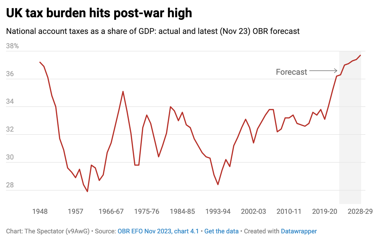 This is why the big question tomorrow remains: what happens to the overall tax burden? Whether Hunt opts for an income tax cut or a NI tax cut, he runs the risk (as he did in the Autumn Statement) of being accused of raising taxes. Despite the 2p off NI last November, the tax burden didn’t budge, remaining on track for tax receipts as a percentage of GDP to hit a post-war high in 2028-29. This makes it very difficult for the Chancellor – or indeed the Prime Minister – to claim they are cutting taxes as they head towards an election. If they want to claim they are the party of tax cuts, the tax burden has to be falling. Income tax cut or NI tax cut: the government can’t be giving with one hand and taking with another.