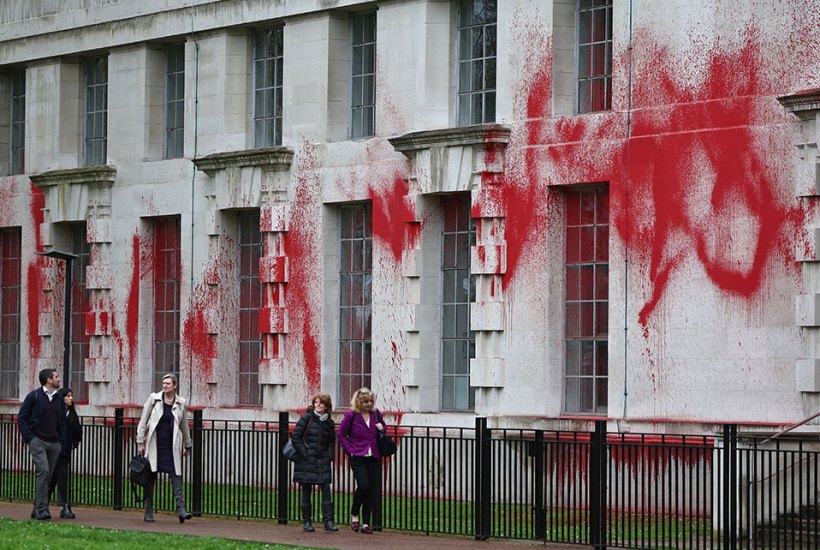 The incident itself happened on 10 April and it was embarrassingly easy for the protestors. The video that’s doing the rounds shows four or five wan eco-toffs (Youth Demand) vaulting the railing in front of the building and then using fire extinguishers filled with house paint to spray the walls. They vault in unison (great for TikTok!) and no one scarpers when the police appear because to get arrested is half the point – also great for social media. There’s a banner: ‘Youth demand an end to genocide.’ And chanting: ‘We’re people united, we’ll never be defeated. Oil is murder.’