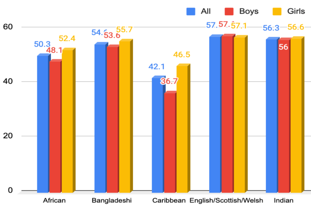 Really? The problem hasn’t gone away: there is still a pretty big attainment gap for pupils from a Caribbean background: the below shows the ‘Attainment 8’ scores at GCSE level by ethnicity in 2022 in the London Borough of Hackney.