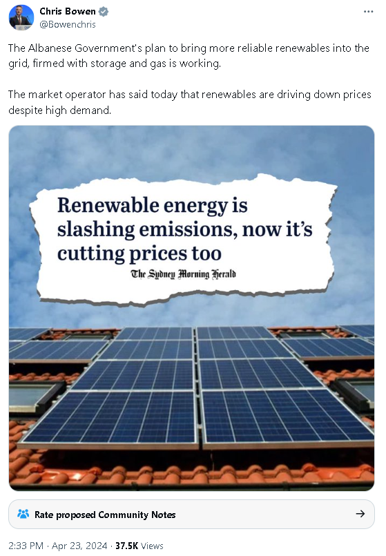 When Groucho Marx said, ‘Who are you going to believe, me or your lying eyes?’ He couldn’t have made a better analogy to describe the clouds of misinformation being blown at us daily. This week, AEMO released its quarterly market report containing all the data and charts you’d expect. Federal Energy Minister Chris Bowen promptly used social media to spread his own version of the truth, that renewables are making electricity cheaper.