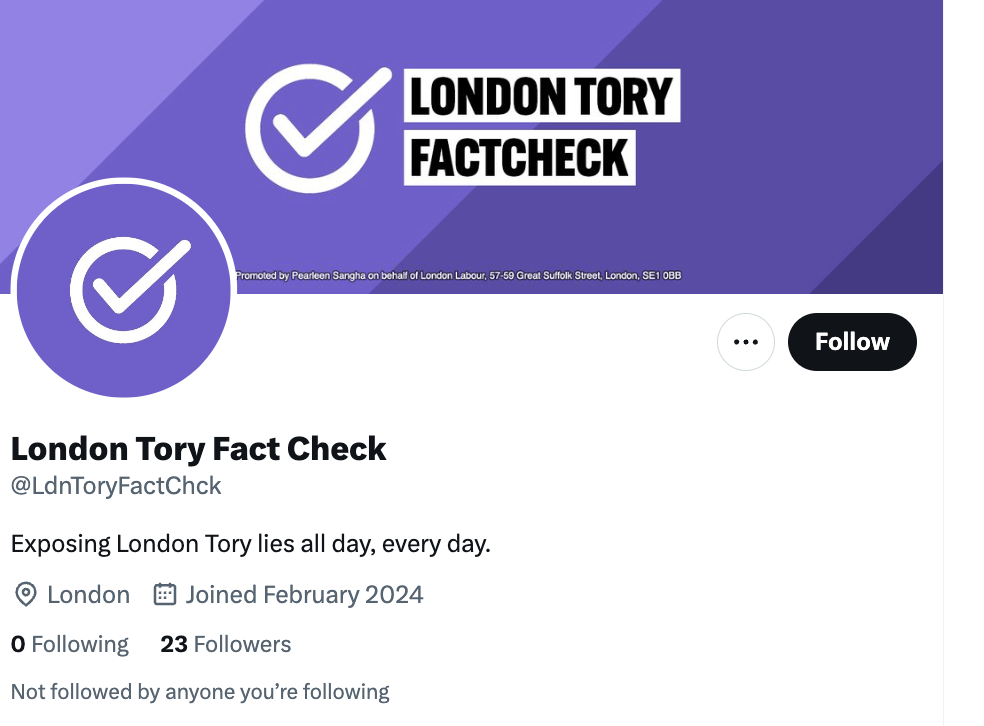 There’s 16 days to go until the London elections and Labour is comfortably in the lead. But is Sadiq Khan now feeling the heat? Perusing Twitter/X this morning, Mr S could not help but notice a new account has sprung up, under the name of ‘London Tory Fact Check’. Its bio reads simply ‘Exposing London Tory lies all day, every day’ and its cover image bears the name of London Labour’s regional director.