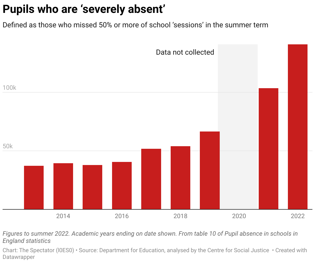 ‘Without a raft of equalising policies, the damaging legacy from COVID-19 school closures will be felt by generations of pupils’, said one of the report’s authors Professor Elliot Major. The results are hardly surprising given the persistent absence problems lockdowns left in their wake. Last spring, 140,000 children in England missed half or more of the school days they should have attended. Research by the Children’s Commissioner, published last year, found that only 5 per cent of these ‘severely absent’ kids go on to achieve five GCSEs. For year ten and 11 pupils who are persistently absent – meaning they miss one day of school a fortnight – just over a third get the minimum five GCSEs. For rarely absent children the figure is 78 per cent.