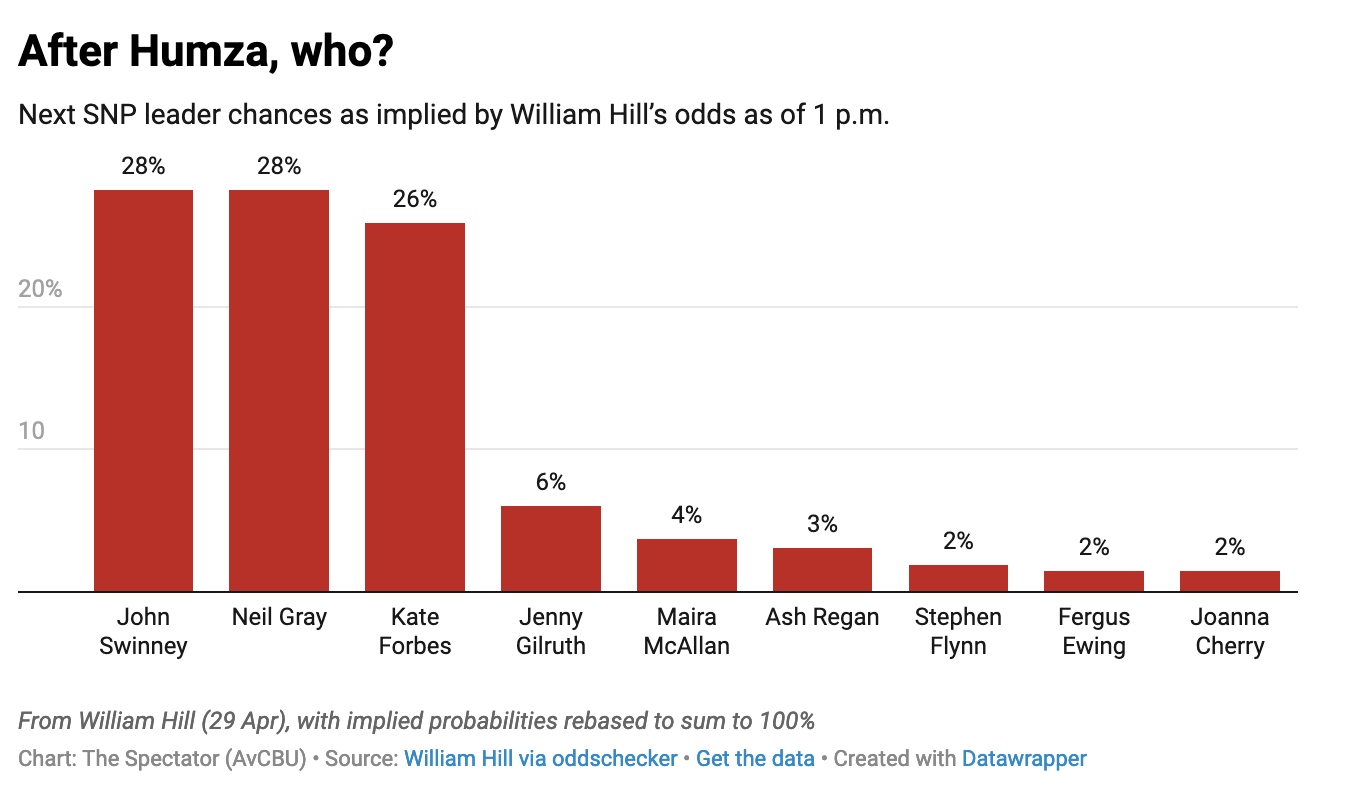 The SNP’s Westminster group leader has made a name for himself after some rather smart politicking in the Commons over ceasefire motions. But while Flynn is seen as one of the more competent Nats, his position as a Westminster MP makes him an unlikely candidate to immediately take over. More than that, Flynn’s feather ruffling seems to have crossed a line with some in the party. He is largely credited with pushing Yousaf to end the Green deal – which is the catalyst for the mess the SNP now finds itself in. One SNP politician told the Times that ‘the mood is fairly unanimous amongst everyone I’ve spoken to at Holyrood that Flynn has to be frozen out. He’s getting a lot of the blame for this.’ Oh dear…